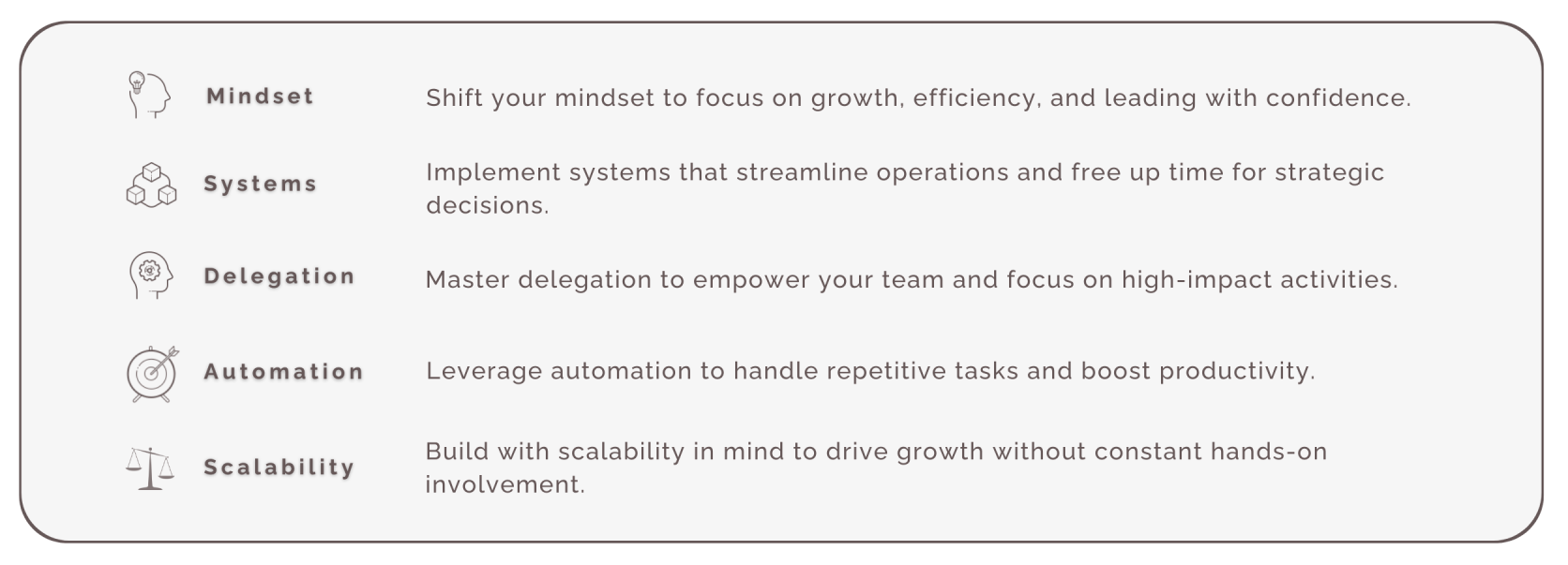 - Access to the comprehensive 5-module course designed to streamline your operations, master delegation, and build a scalable business.
